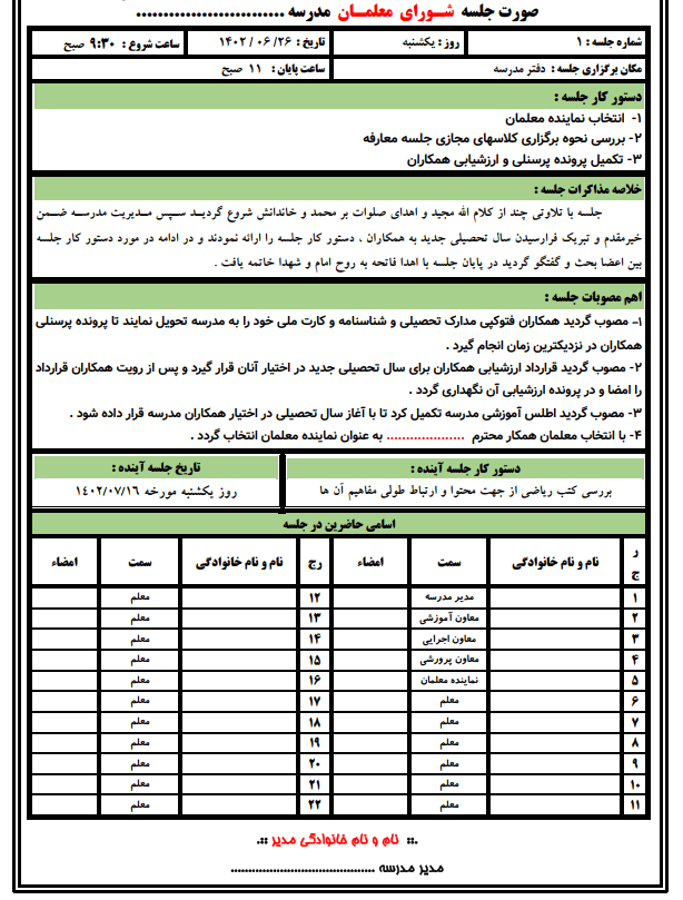 - در پایان، صورتجلسه باید توسط اعضای حاضر در جلسه، بهویژه مدیر مدرسه و معلمان امضا شود تا صحت اطلاعات و تصمیمات گرفتهشده تایید گردد.